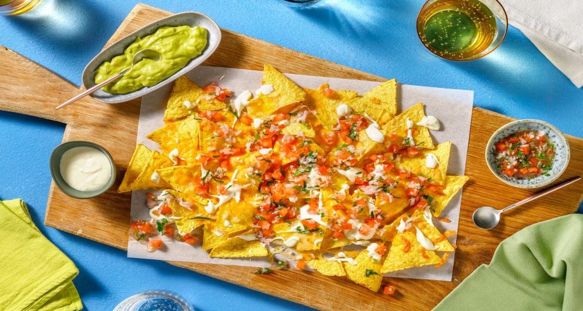 Chips, fromage, jalapenos, guacamole